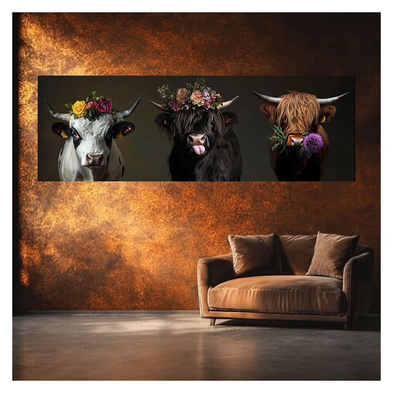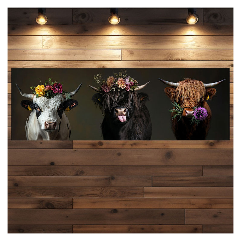 Mit diesem Kunstwerk bringen Sie Stil, Witz und Natur pur in Ihre vier Wände. Die Panorama-Leinwand zeigt drei ikonische Rindviecher, wie man sie sich schöner nicht vorstellen könnte: